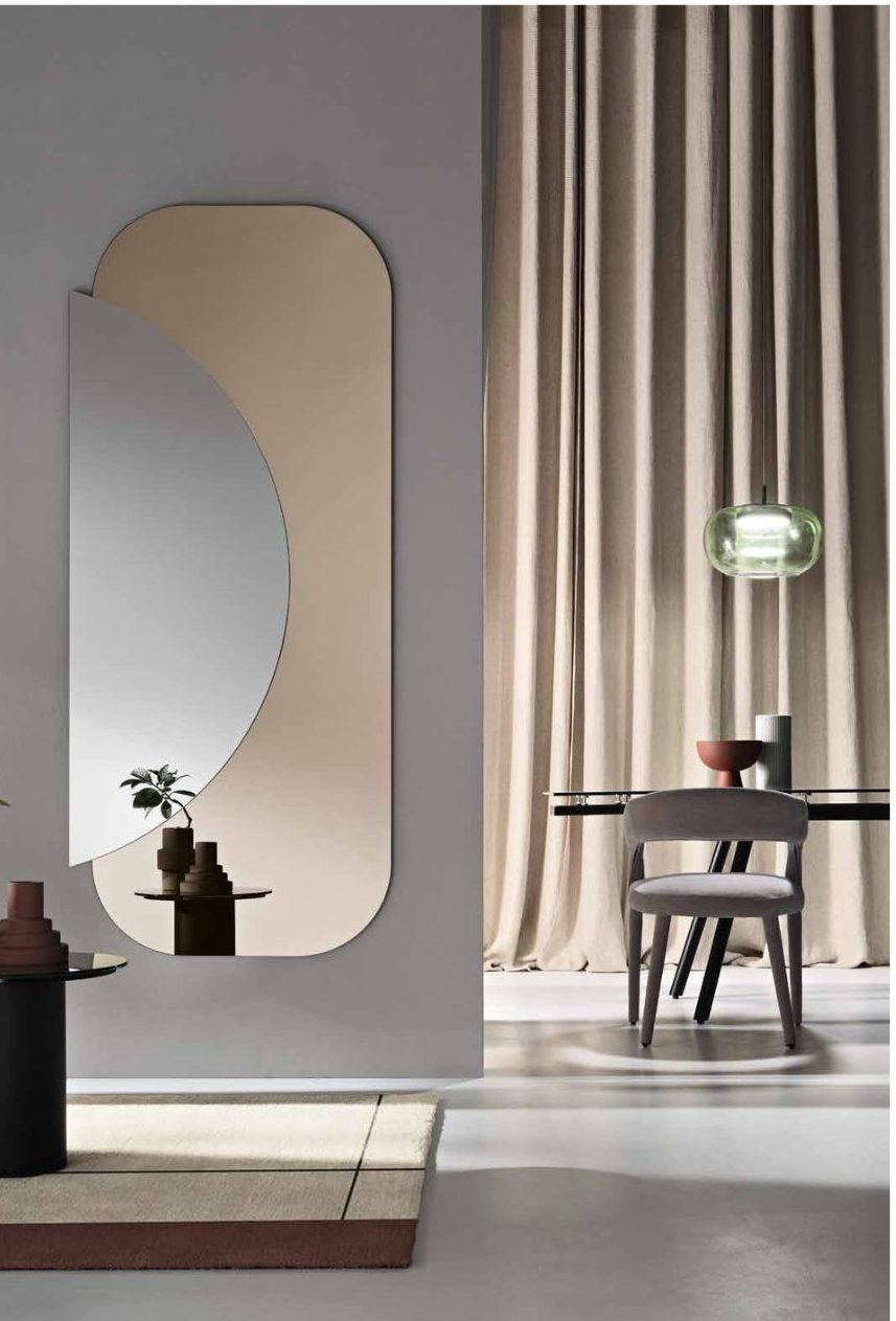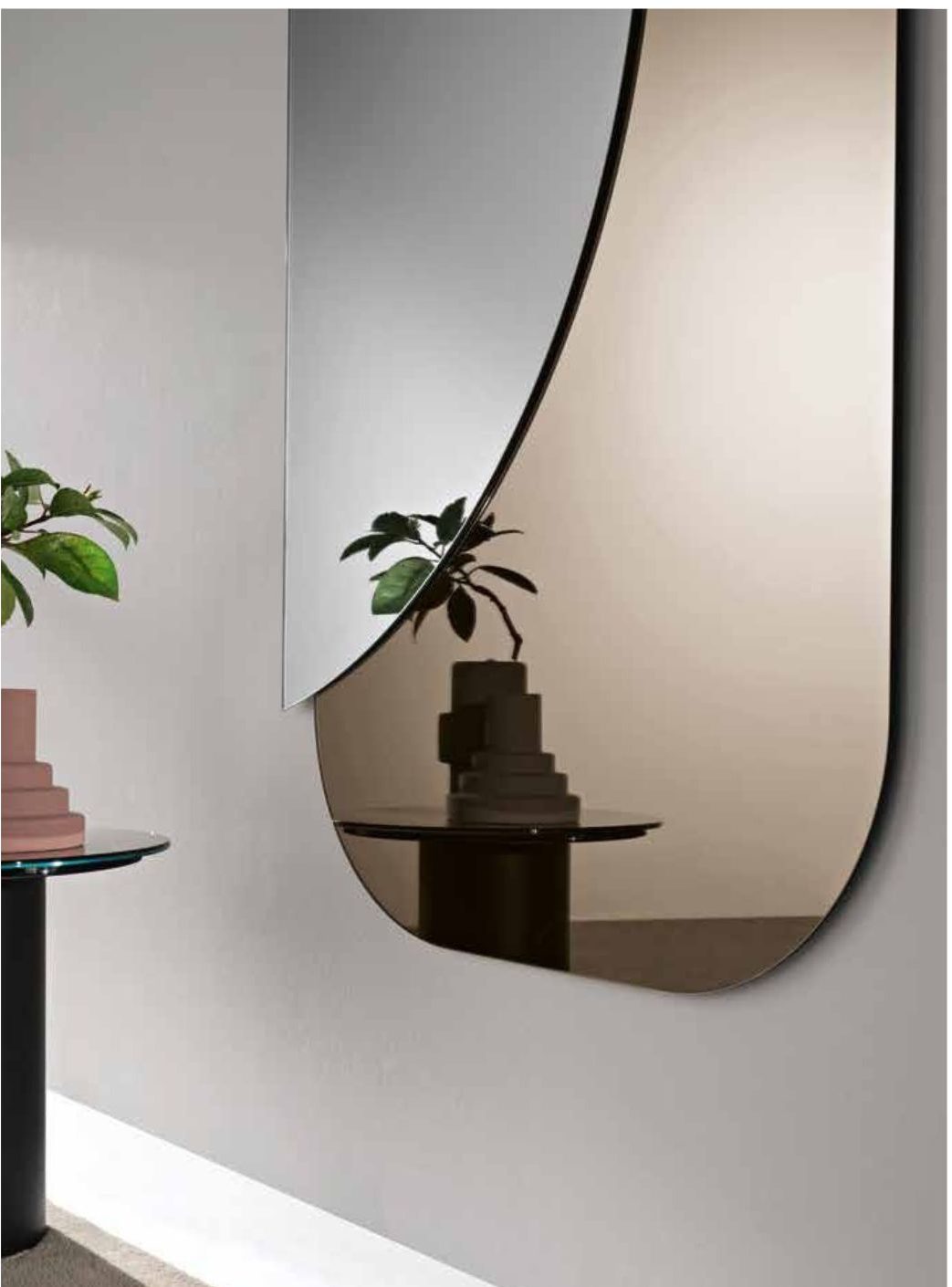 Specchio formato da due lastre sagomate sovrapposte, disponibile in due dimensioni e due colori.