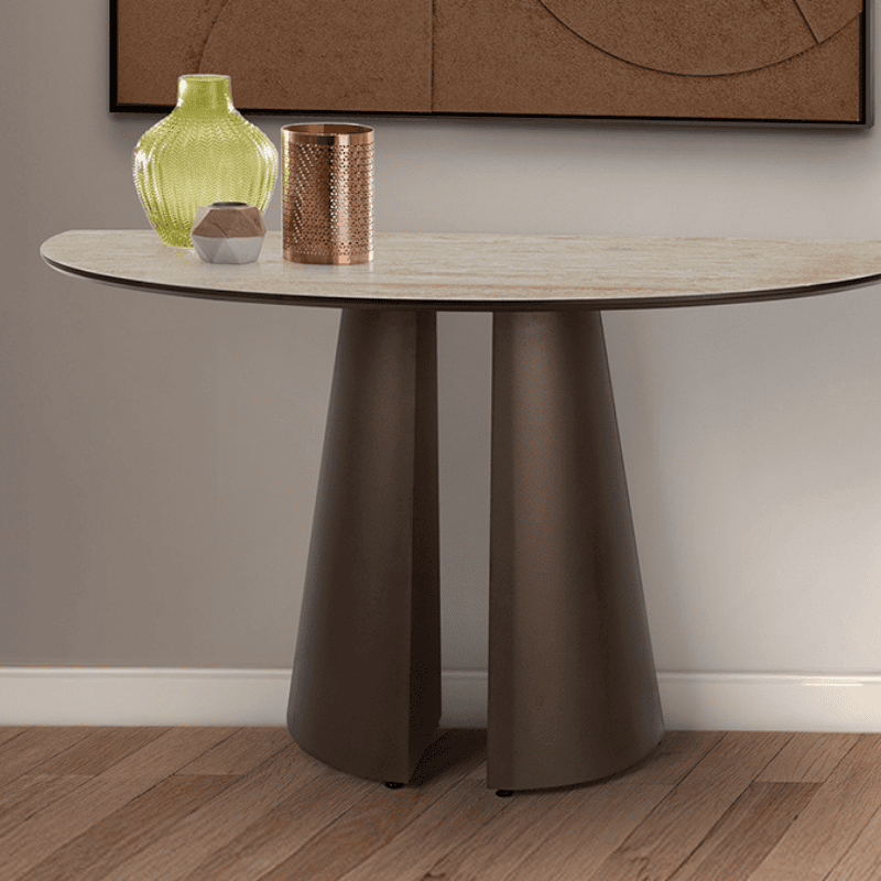 Console in metallo rifinita color marrone ossidato. Superficie in MDF rivestita da melamine ad alta resistenza. Finiture in marmo travertino e bordi in color marrone ossidato. materiale:metal, MDF ,melamine