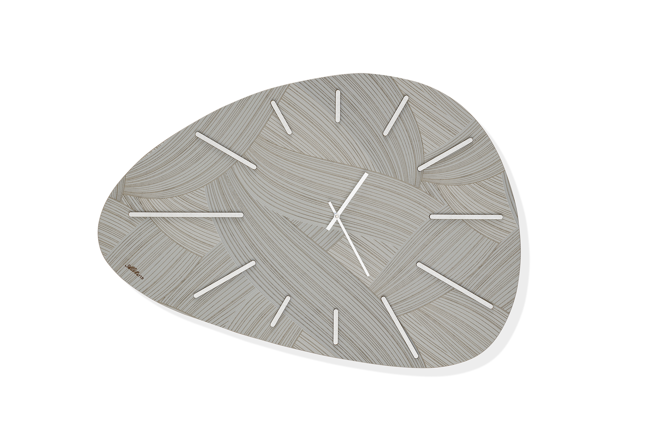 Orologio sagomato da parete in carta da parati, numero a rilievo in legno decorato, lancette in alluminio, meccanismo al quarzo, posizionamento VERTICALE/ORIZZONTALE.