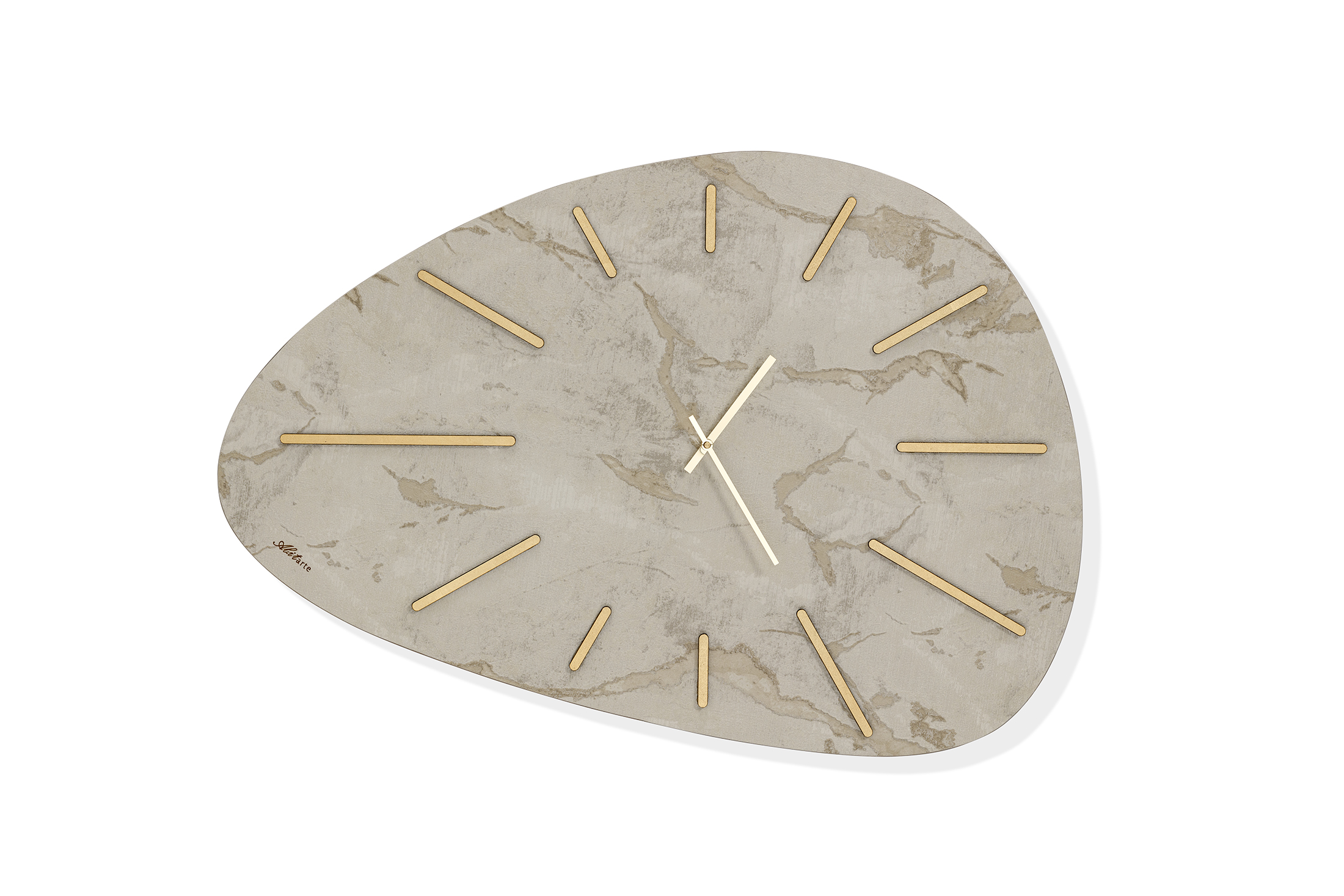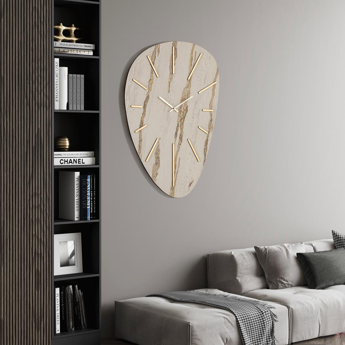 Orologio sagomato da parete in carta da parati, numero a rilievo in legno decorato, lancette in alluminio, meccanismo al quarzo, posizionamento VERTICALE/ORIZZONTALE.