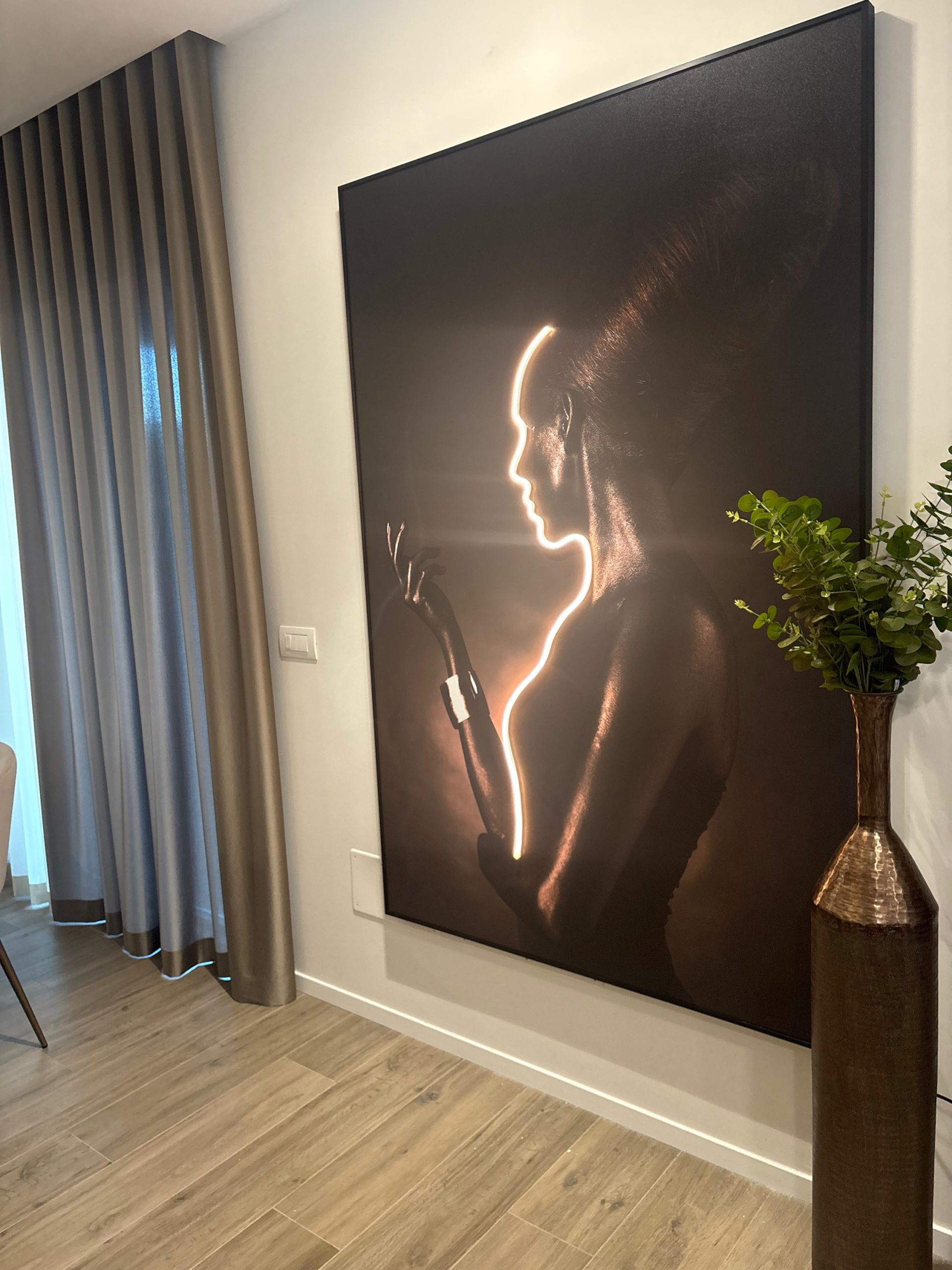Quadro silueta cruz dimensione 120 cm x180 cm. Quadro in stampa artistica su pannello con cornice nera. Perfetto per ambienti moderni come salotto, camera o ufficio. La luce LED crea un’atmosfera elegante e accogliente.
