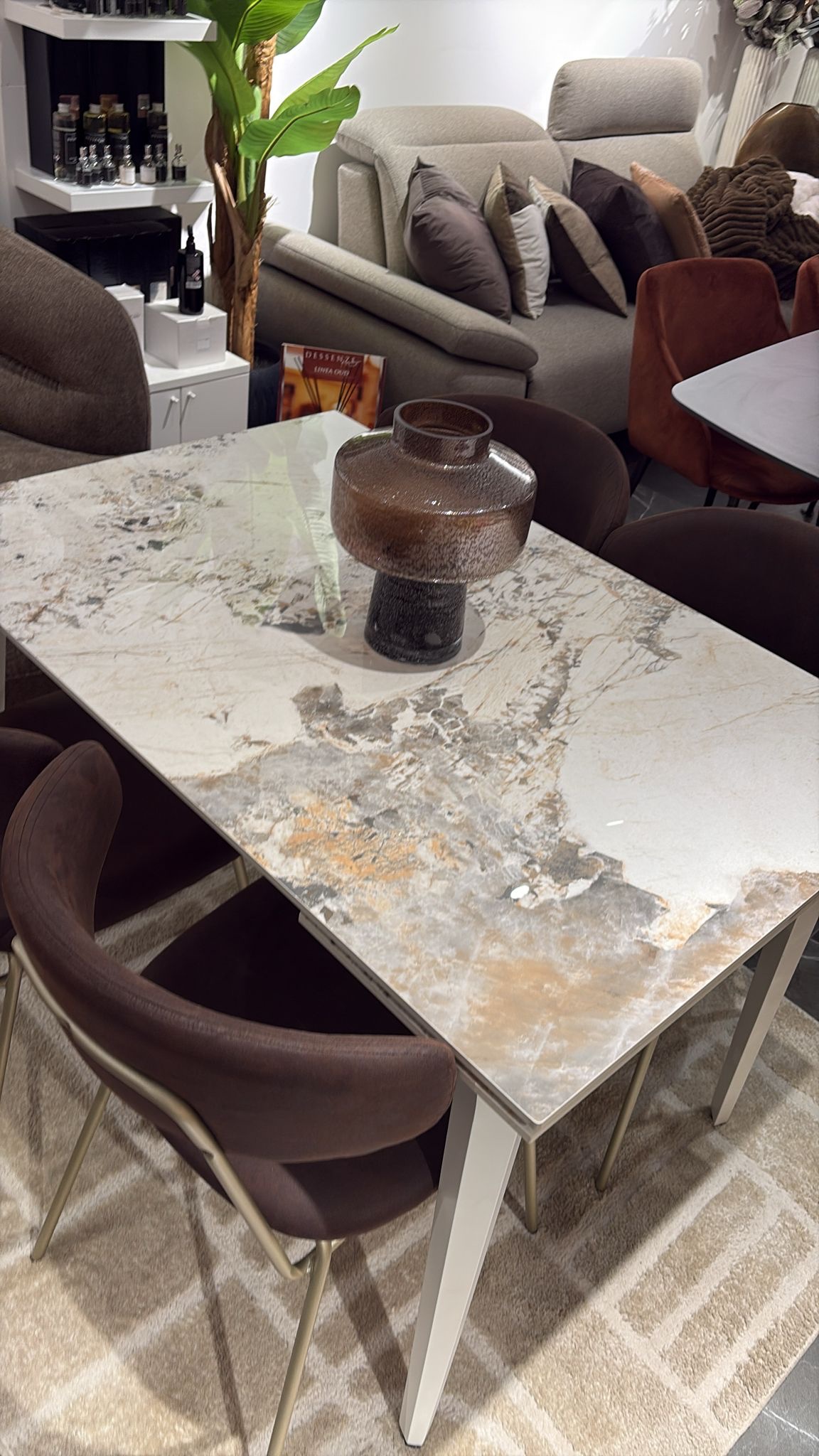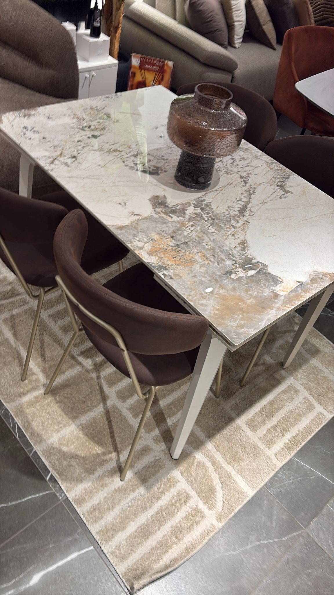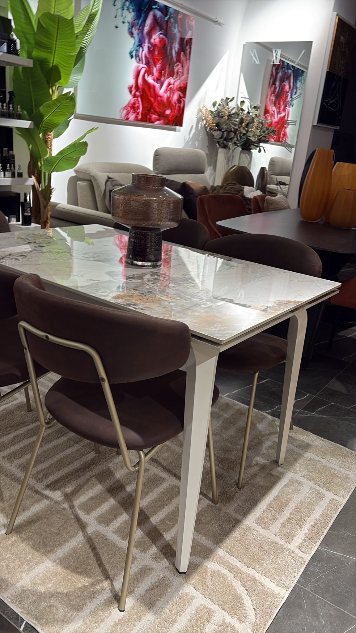 Tavolo allungabile in pietra sinterizzata effetto marmo, con due allunghe da 35 cm;
