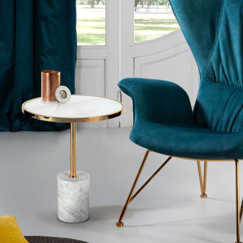 La base in ferro con finitura oro dona un tocco di lusso e stabilità, mentre il piano d’appoggio circolare in mdf può essere di due finiture differenti.